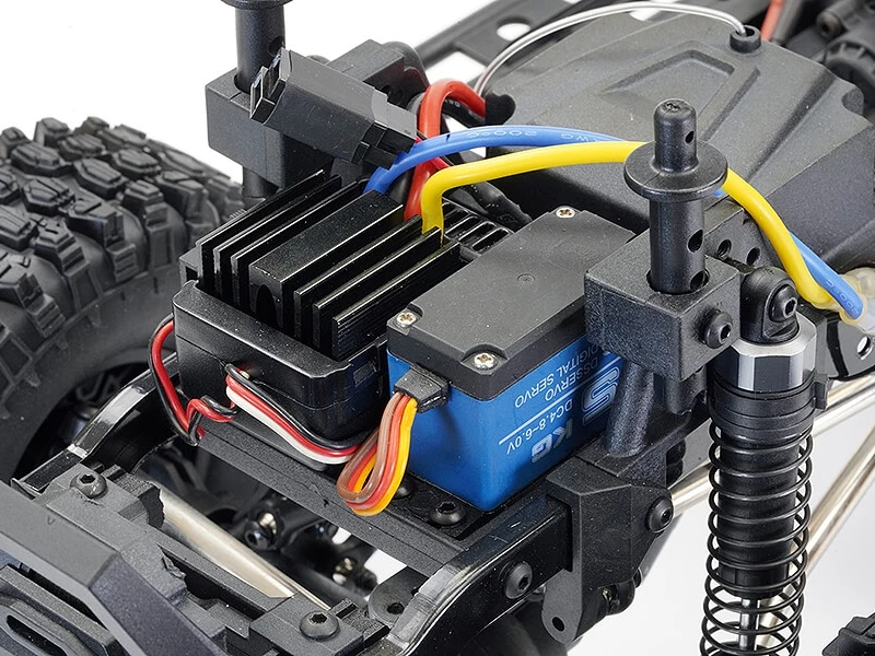 An Etronix 15kg metal geared servo and horn now take on the heavy steering. 6mm steel links feature increased bend angle for better clearance over rocks and new aluminium axle link mounting point addsstrength.