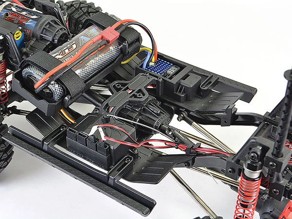 Underneath the GEO utilises a split-transmission design that provides a lower centre CG transfer case to help accommodate interiors, provide better low speed torque and minimise torque twist. The battery has been moved further forward and along with the front positioned motor and 15kg metal geared steering servo taking on inclines has never been easier, especially with the beadlock wheel mounted Fastrax Matador tyres!