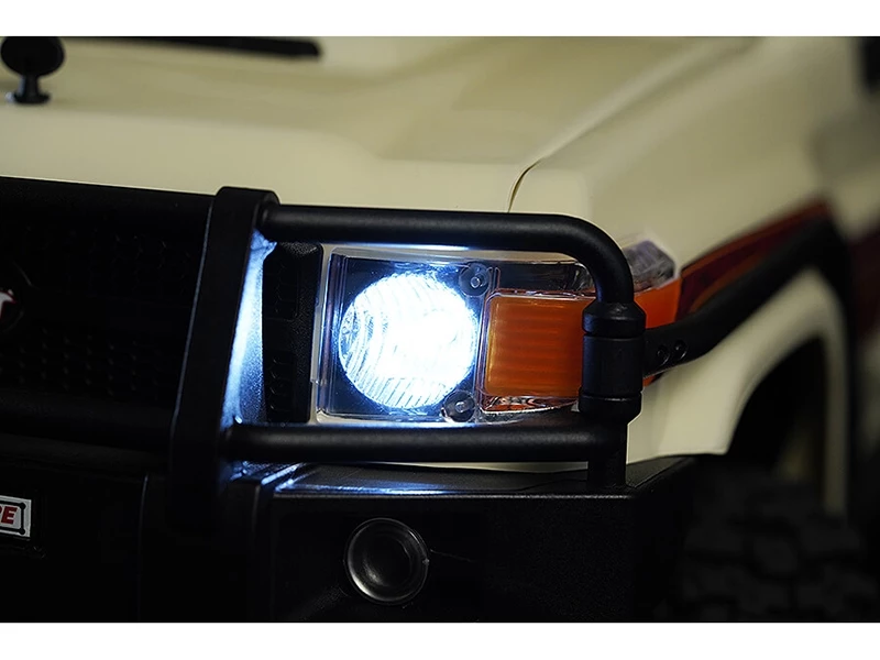 An authentic looking transmission casing, with engine cover over hiding the 25kg metal gear rated steering servo and 20-turn brushed 550 motor as some scale realism, along with moulded inner fenders, rubber mud flaps and side plates.